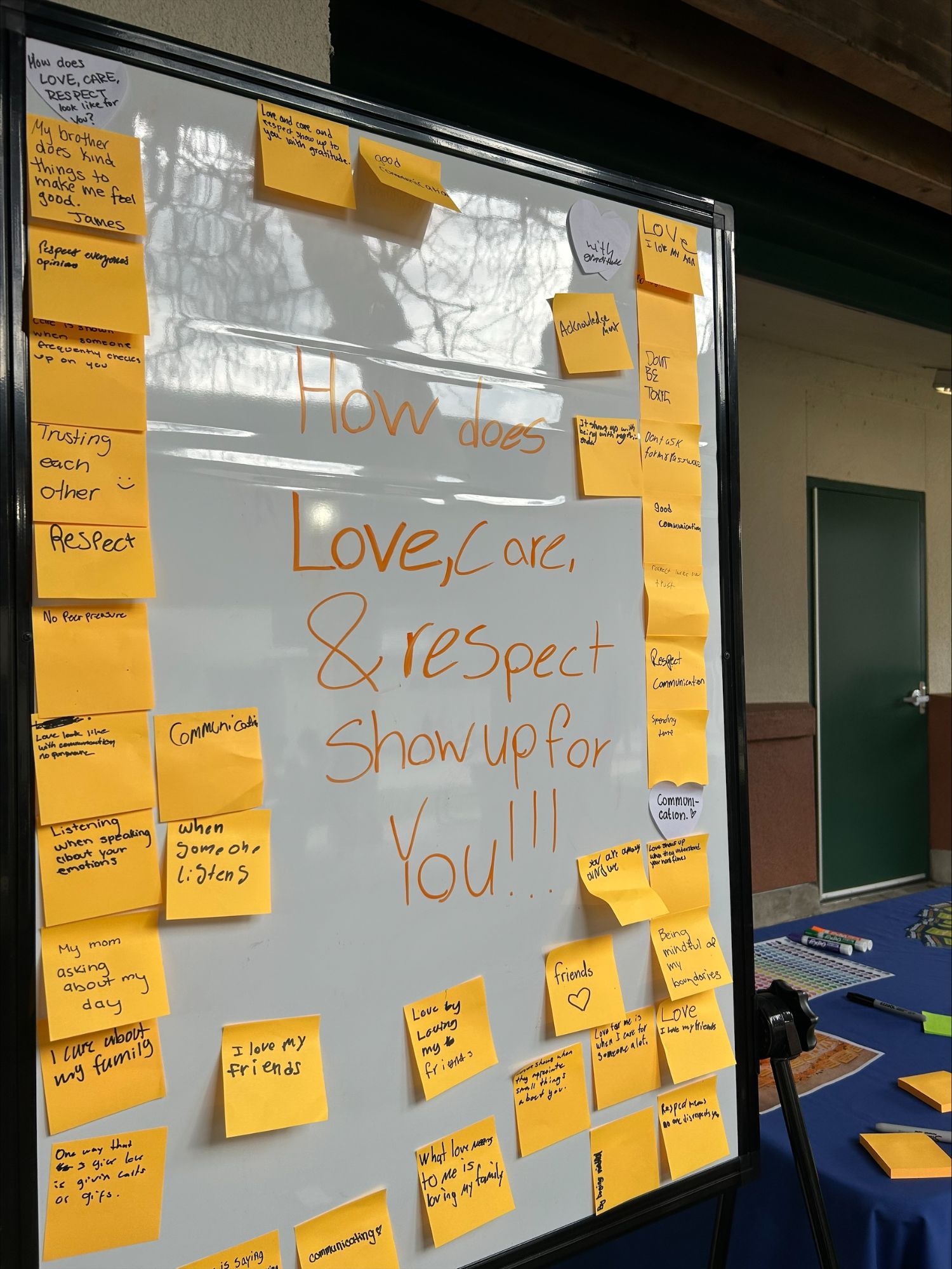 At Calistoga Junior Senior High School’s Kindness Fair, approximately 150 students connected with community partners and participated in interactive activities. CLAR@ mentors and student leaders facilitated a reflection activity asking, “How does love, care, and respect show up for you?” Students’ responses were displayed as a collective art piece in the cafeteria, reinforcing positive relationship norms across campus.